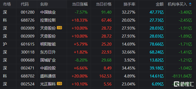 龙虎榜中涉及机构专用席位的个股中,单日净卖出额前三为中国铀业、拉普拉斯、天奇股份,分别为3.40亿元、2.45亿元、1.89亿元。