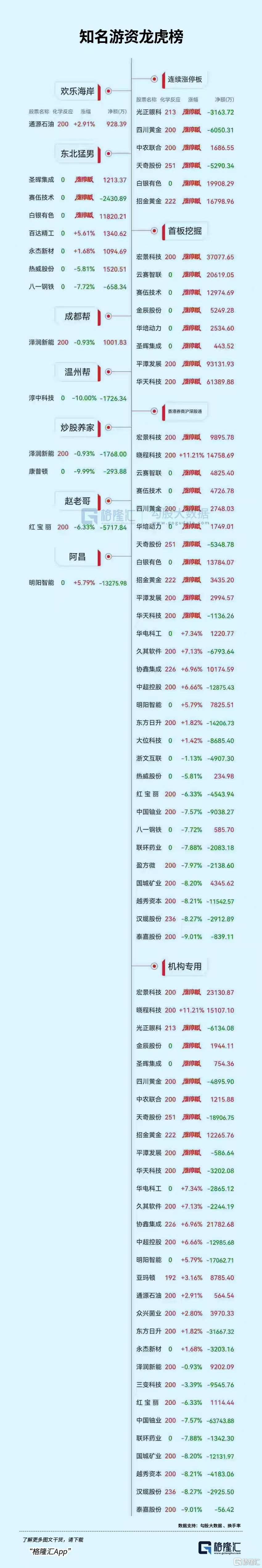 晓程科技:当日收报58.83元,涨跌幅11.21%,偏离值33.81%,换手率33.81%,成交额44.63亿。龙虎榜数据显示,机构净买入1.42亿元,深股通专用席位净买入1.48亿元,成都系净卖出4574万元。