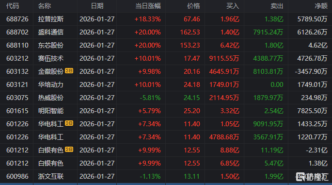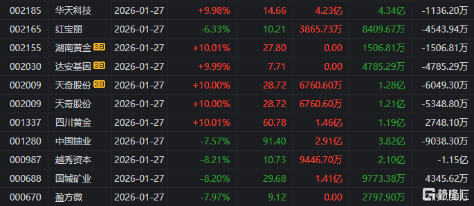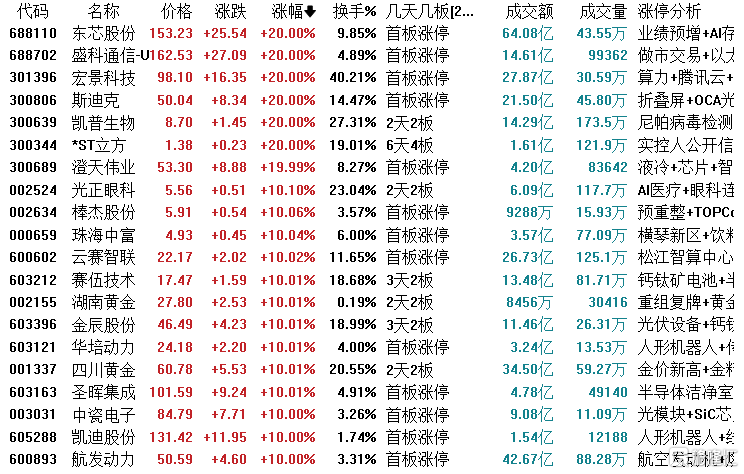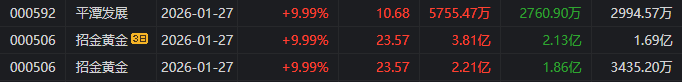 个股方面,贵金属板块白银有色6连板、四川黄金9天5板、招金黄金7天4板、湖南黄金2连板,太空光伏概念股拓日新能10天5板,AI应用端的天地在线7天4板。