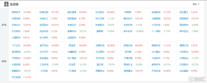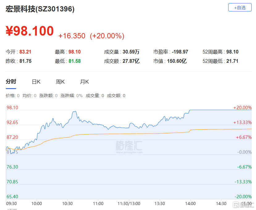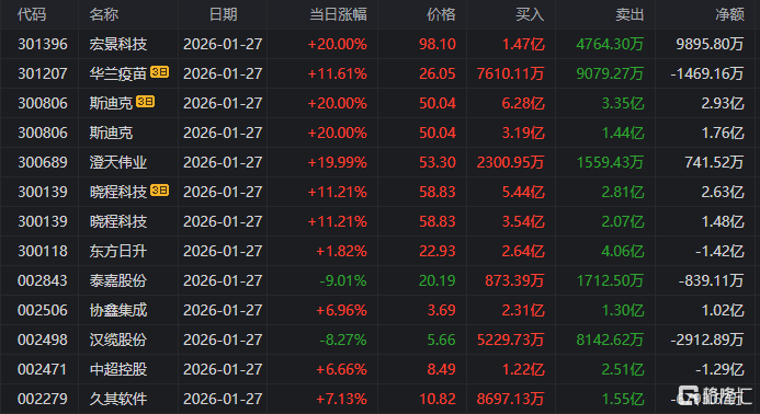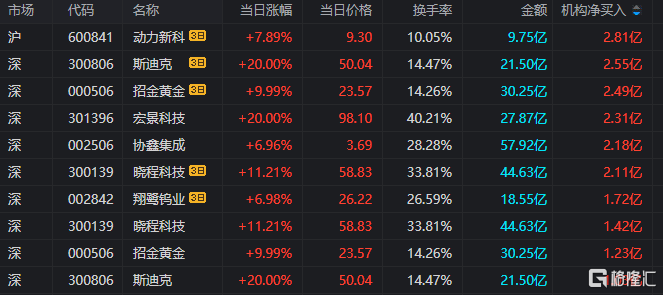 宏景科技:当日收报98.1元,涨跌幅20.00%,偏离值39.03%,换手率40.21%,成交额27.87亿。龙虎榜数据显示,机构净买入2.31亿元,深股通专用席位净买入9895.80万元,中山东路净买入5881万元。