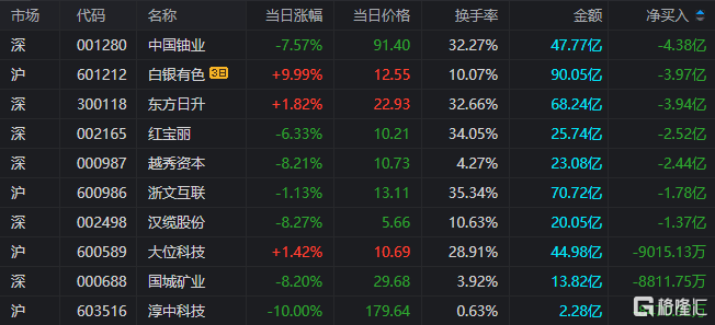 中超控股:当日收报8.49元,涨跌幅6.66%,偏离值34.43%,换手率34.45%,成交额39.18亿。龙虎榜数据显示,机构净卖出1.04亿元,深股通专用席位净卖出1.29亿元。