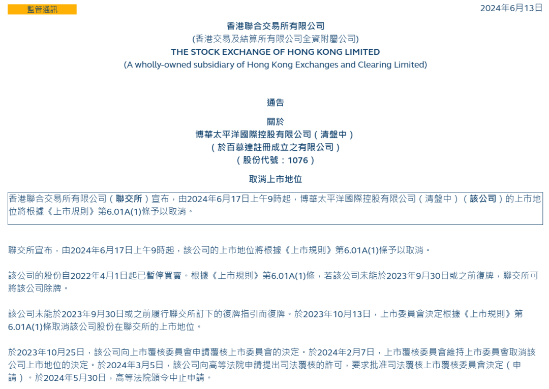 2022年4月,公司因审计问题被港交所停牌;2024年6月,其上市地位被正式被取消。