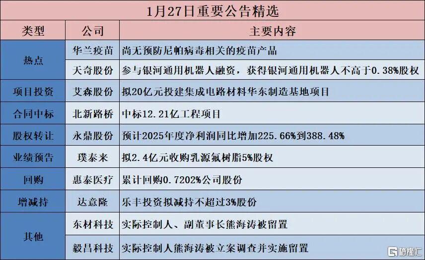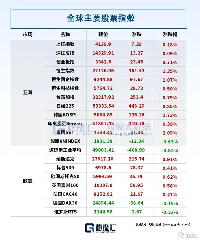 昨日,A股方面,沪指涨0.18%,深证成指涨0.09%,创业板指涨0.71%。全市场成交额2.92万亿元,超3400股下跌。半导体、汽车芯片、光伏设备板块涨幅居前;猪肉、煤炭板、钛白粉等板块跌幅居前。