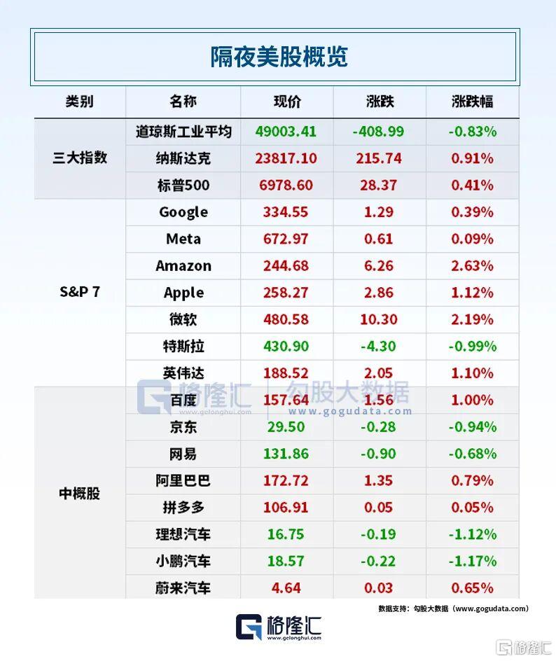 大型科技股多数上涨,亚马逊涨2.63%,微软涨2.19%,苹果涨1.12%,英伟达涨1.1%,谷歌、meta涨不足1%,特斯拉跌近1%。