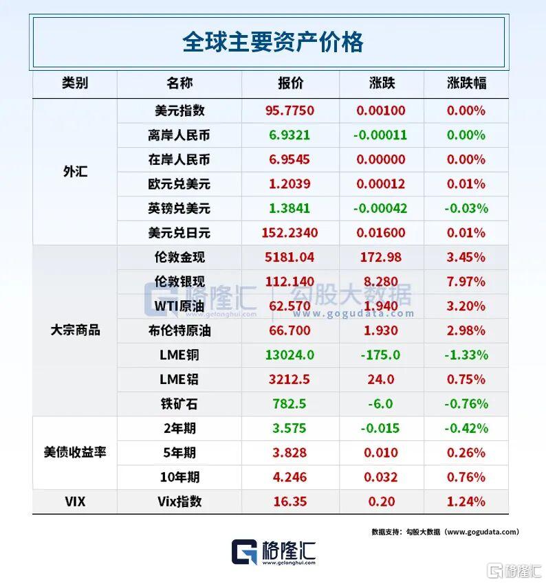 全球资产表现上,国际油价走高,WTI原油期货收报62.57美元/桶,涨幅3.20%。布伦特原油期货收报66.70美元/桶,涨幅2.98%。现货黄金涨3.45%,报5181.04美元/盎司,最高触及5190.06美元/盎司创历史新高。现货白银涨7.97%%,报112.14美元/盎司。