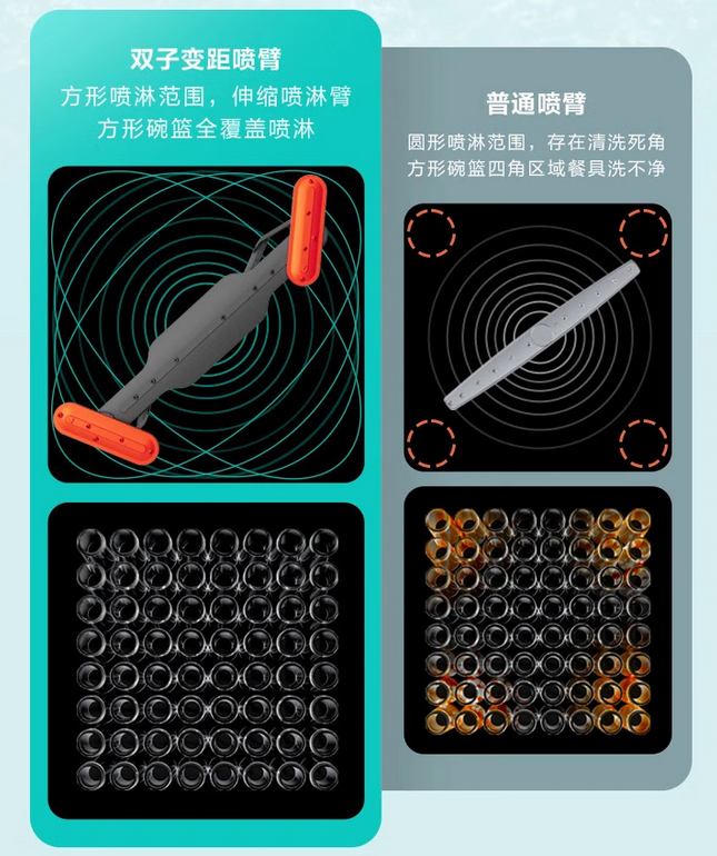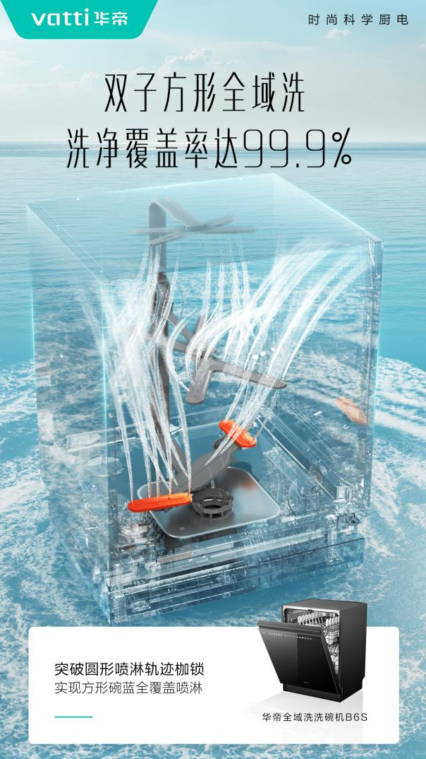 主打高效洁净的华帝洗碗机B6S,搭载自研专利双子变距全域洗技术,下层双子喷臂可自动调节长度与角度,突破传统圆形喷淋局限,实现方形碗篮区域全覆盖冲洗。其洗净覆盖率高达99.9%,获得了中国家用电器研究院1级认证。同时产品达到一级水效,在强效去污的同时更节水,契合家庭日常使用需求。