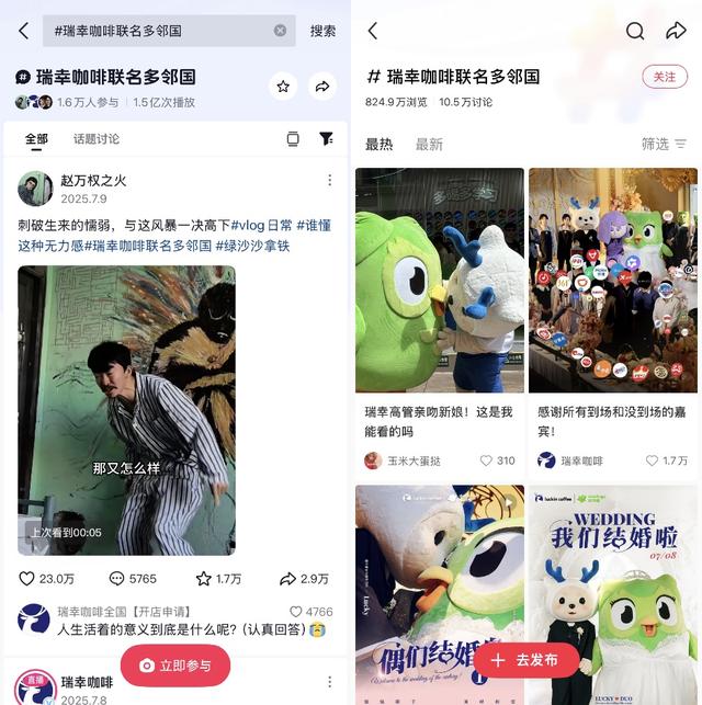 瑞幸咖啡则积极通过互联网营销打造企业IP,其与教育类APP多邻国的趣味联动,成为2025年的经典营销案例。瑞幸的麋鹿形象与多邻国的绿鸟形象,结成了跨越种族的CP,并在抖音、小红书等平台上持续记录了“婚礼日常”,甚至拍摄了“豪门联姻”的短剧。