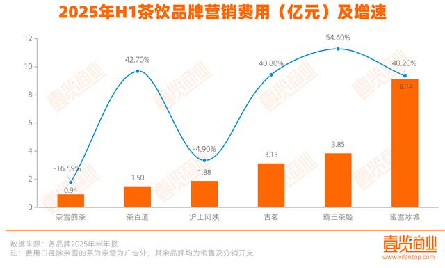 据壹览商业不完全统计,截至2025年上半年,上市茶饮品牌中,仅奈雪的茶营销相关费用不足1亿元,且同比下降了16.59%;蜜雪冰城、古茗、茶百道、沪上阿姨、霸王茶姬营销相关费用均过亿元,其中沪上阿姨同比增速下降了4.90%,而蜜雪冰城、古茗、茶百道的营销相关费用同比增长均超过40%。
