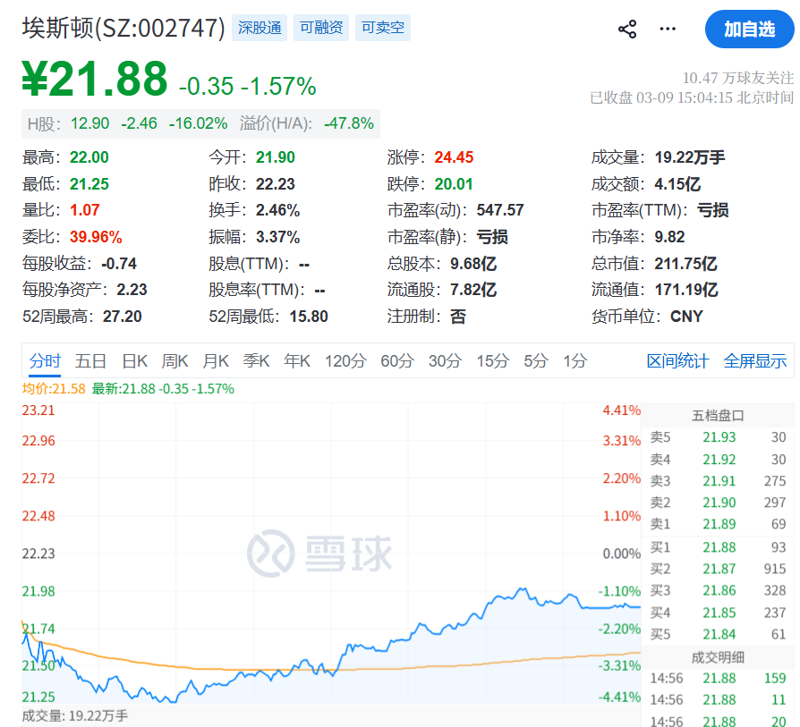 截至3月9日收盘,其A股股价报21.88元,跌幅1.57%,总市值约211.75亿元。若按今日汇率与港股价格计算,H股相较A股折价47.81%,两地估值差距较为明显。