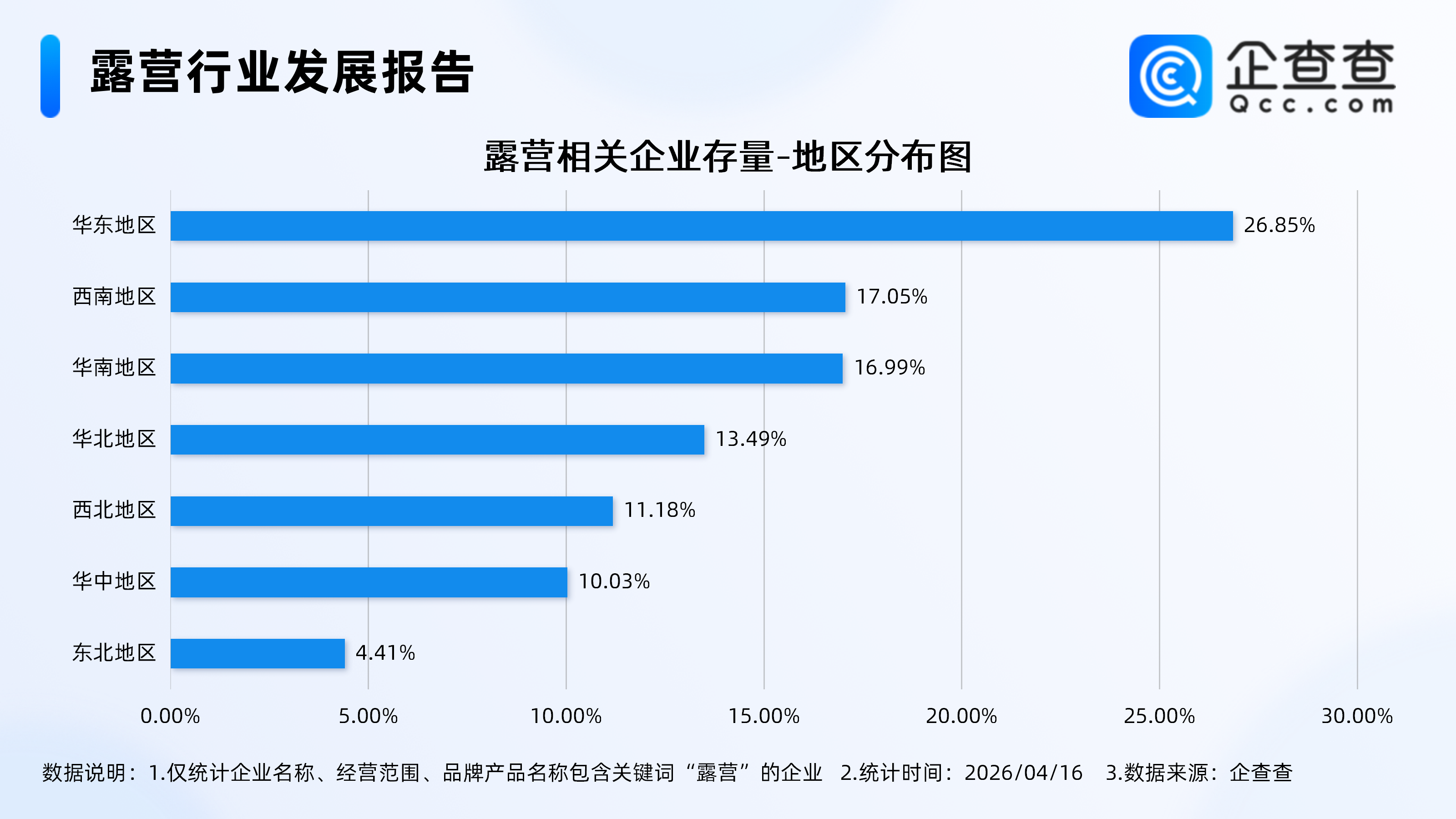 企查查数据显示,从地区分布来看,分布在华东地区的露营相关企业最多,占比26.85%。其次,分布在西南地区、华南地区的相关企业分别占比17.05%、16.99%。