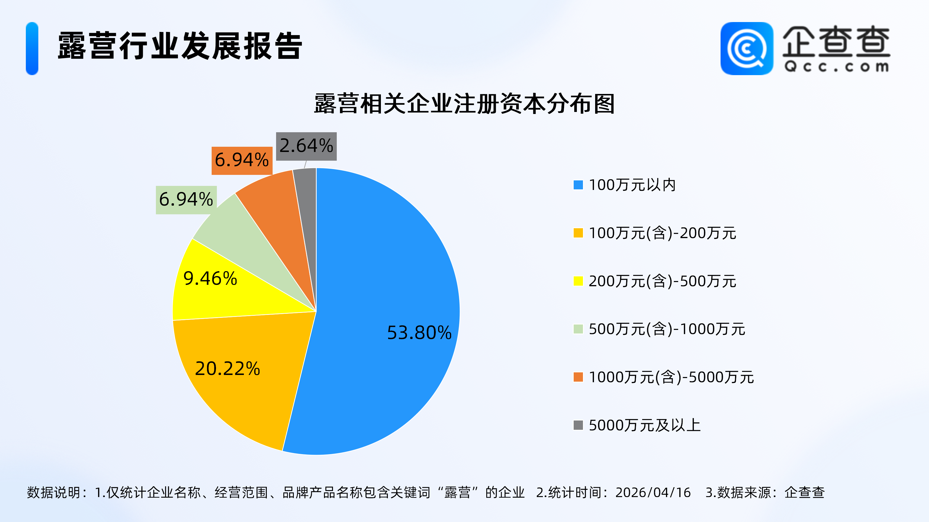 企查查数据显示,截至4月16日,国内现存露营相关企业28万家。近十年相关企业注册量呈整体增长态势,2025年全年注册6.66万家。截至目前,今年已注册1.61万家。存量方面,从注册资本来看,露营相关现存企业多为轻量级企业,其中注册资本在100万元以内的企业最多,占比达53.80%。从地区分布来看,分布在华东地区的露营相关企业最多,占比26.85%。