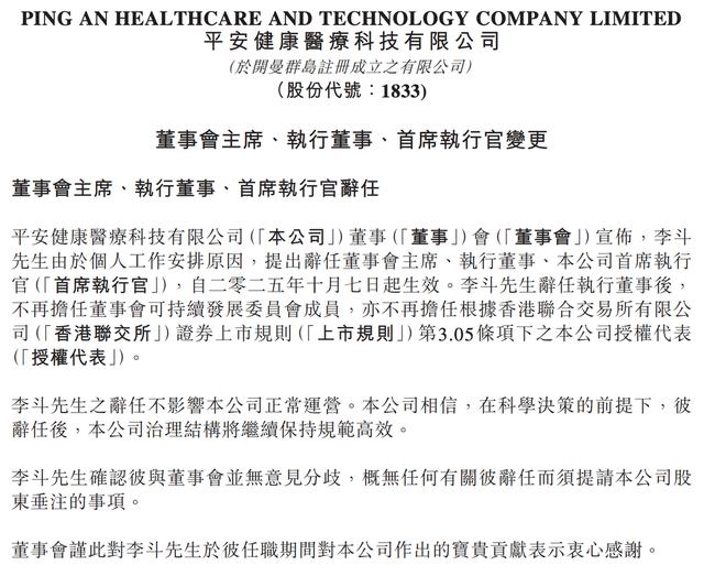 同年10月,平安好医生再次发布公告,任命郭晓涛为该公司董事会主席(即董事长),委任何明科为首席执行官、执行董事。相比之下,李斗因个人工作安排辞任董事会主席、执行董事及首席执行官职务。
