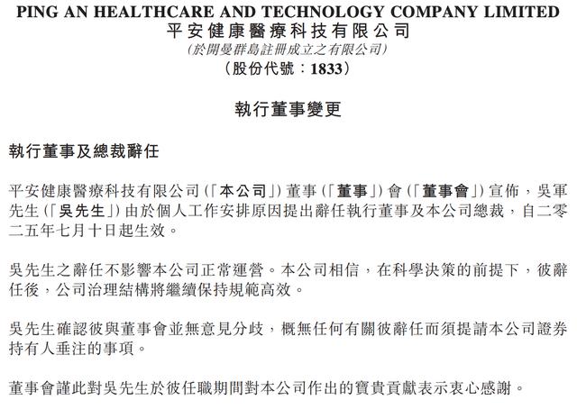 平安好医生的管理层变动历来是市场关注的焦点。2025年7月,执行董事兼总裁吴军因个人工作安排原因辞任,CFO臧珞琦被委任为执行董事。据贝多商业&贝多财经了解,这是该公司近年来的又一次高管调整。