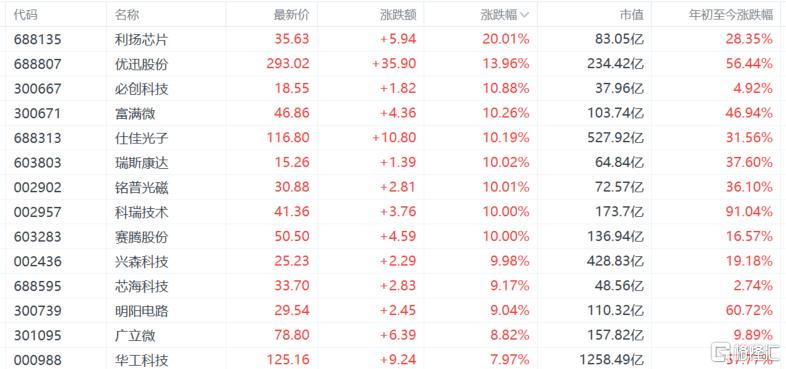 截至收盘,A股利扬芯片瑞斯康达科瑞技术赛腾股份等多股涨停,海光信息涨超5%,中科曙光涨超4%。