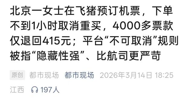 最近,多家媒体报道了这样一则案例,有个用户在飞猪订机票,1小时内取消,4000多块钱的票款只退了415元