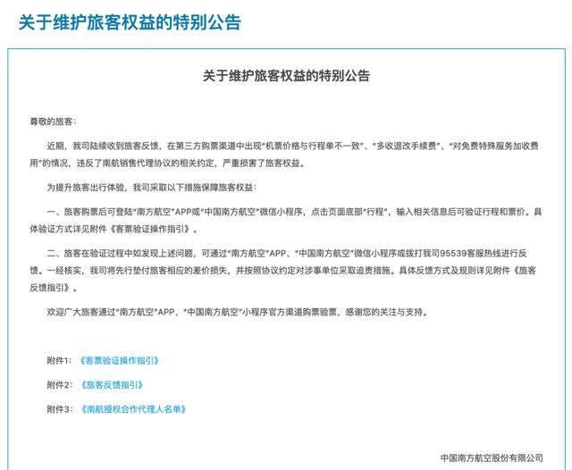 去年三月,三大航就集体发了维护旅客权益的公告。南航的公告里直接提到,第三方购票渠道“机票价格与行程单不一致”、“多收退改手续费”、“对免费特殊服务加收费用”等情况,违反了南航销售代理协议的相关约定,严重损害了旅客权益。