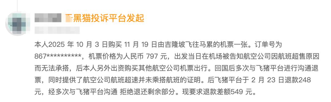 还有用户遇到航班超售,提供了航空公司的证明后,飞猪也只给用户退了一小部分款项。