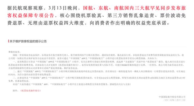今年3月13日,三大航再一次发布旅客权益保障专项行动,再次围绕票价波动、误购错购等旅客反馈集中的问题,推出便利政策。