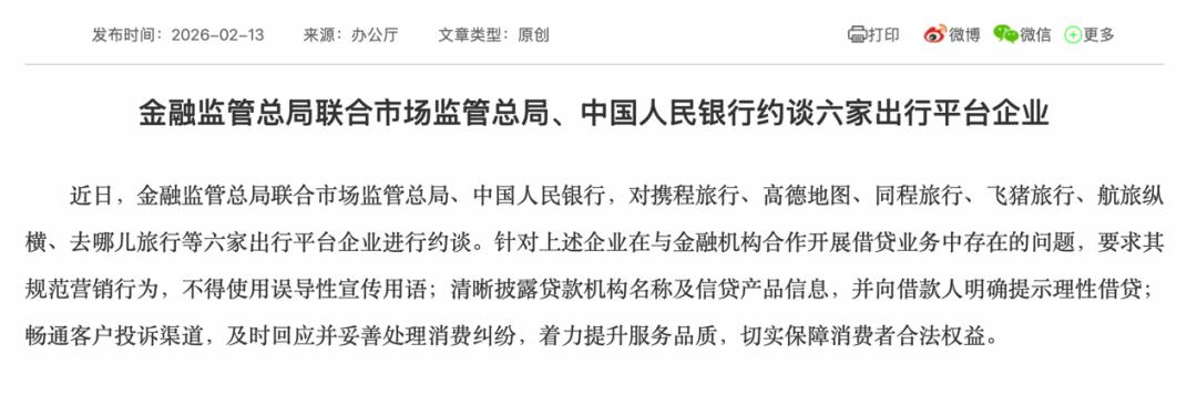 今年2月,金融监管总局联合市场监管总局、中国人民银行,对携程、同程、飞猪旅行等六家出行平台企业进行约谈,约谈主要是针对上述企业在与金融机构合作开展借贷业务中存在的问题展开。