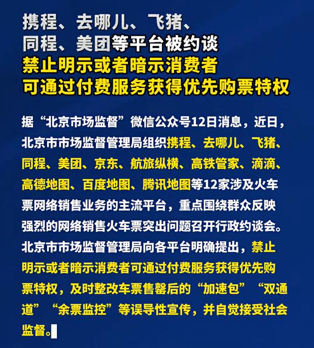 今年2月,北京市市场监督管理局组织携程、去哪儿、飞猪、同程12家涉及火车票网络销售业务的主流平台,明确要求整改“加速包”“双通道”“余票监控”等误导性宣传。