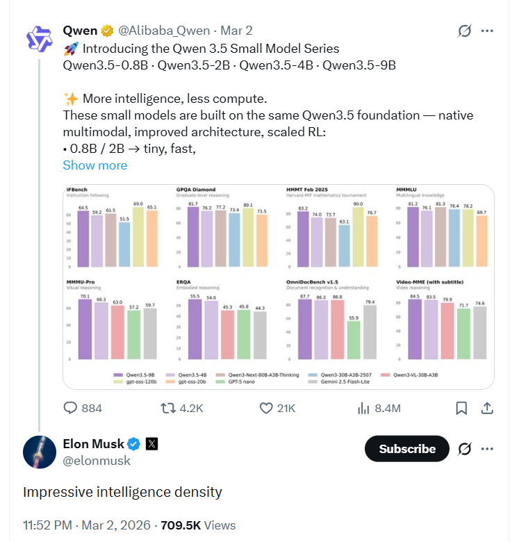此次发布吸引了马斯克的关注,他在X上写道,这些模型展现了“令人印象深刻的智能密度”。