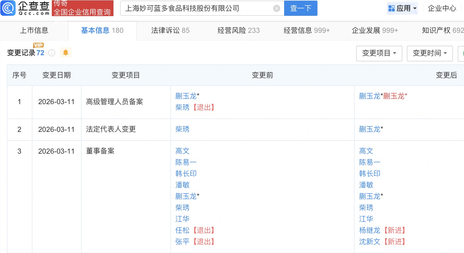 企查查APP显示,近日,妙可蓝多(600882)发生工商变更,创始人柴琇卸任法定代表人,由蒯玉龙接任。 企查查信息显示,该公司成立于1988年11月,注册资本约5.1亿元,经营范围包括食品经营、食品互联网销售、互联网直播服务等,由内蒙古蒙牛乳业(集团)股份有限公司、柴琇等共同持股。