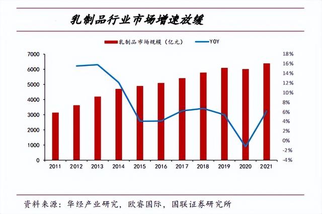 从乳业市场发展来看,随着乳制品行业增速逐渐放缓,据资料显示,目前乳制品行业正从增量转向存量竞争,我国乳制品行业2015年规模为4896亿元,行业增速见顶,之后增速逐年下滑,从量增驱动转向价增驱动。