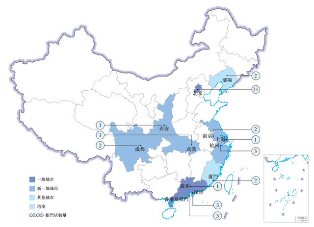 但由于知名度、品牌声量无法与全国性老牌黄金珠宝相匹敌,老铺黄金选择另辟蹊径,在高价位、精渠道定位上下功夫,光是门店选址便十分讲究,多为一线或新一线城市黄金地段中的大型购物中心,如北京SKP,南京德基等。