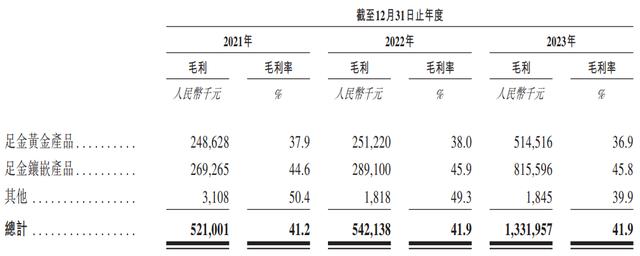 老铺黄金方面表示,由于古法黄金珠宝的工艺更为复杂精密,且消费者愿意为足金镶嵌古法黄金珠宝支付溢价,因此毛利率通常高于其他黄金珠宝。招股书亦显示,该公司的足金镶嵌产品2020年至2023年的毛利率分别为44.6%、45.9%和45.8%。