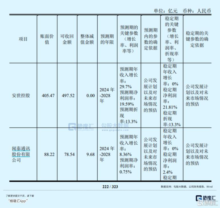 目前尚未积累减值金额,但公司在“可收回金额的具体确定方法”中列出,预期2024年至2028年期间安世半导体年收入增长率29.7%,净利润率19.59%。