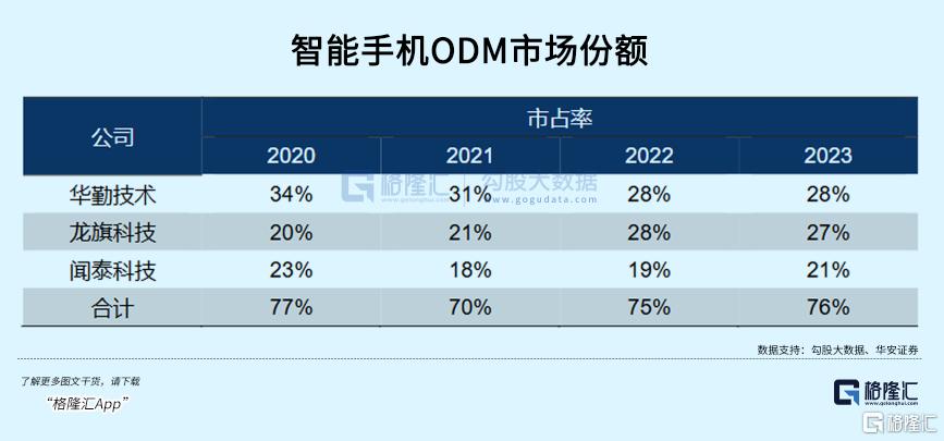 Counterpoint数据显示,2023年,华勤技术和龙旗科技在智能手机ODM市场的占有率分别为27.9%和27.3%,闻泰科技则以20.6%的市占率位列第三。