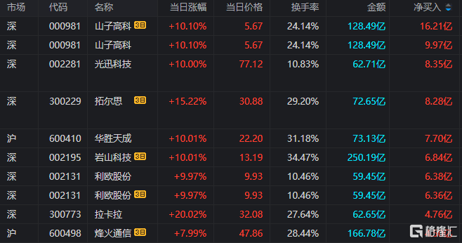 龙虎榜单日净买入额前三为山子高科、光迅科技、华胜天成,分别9.97亿元、8.35亿元、7.70亿元。