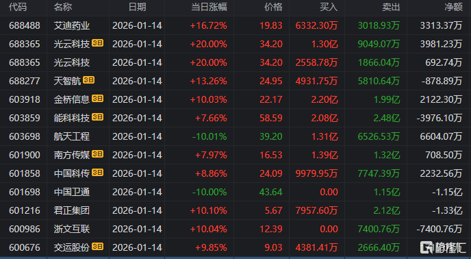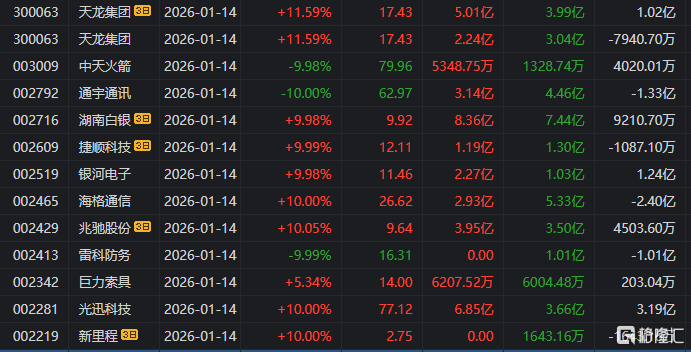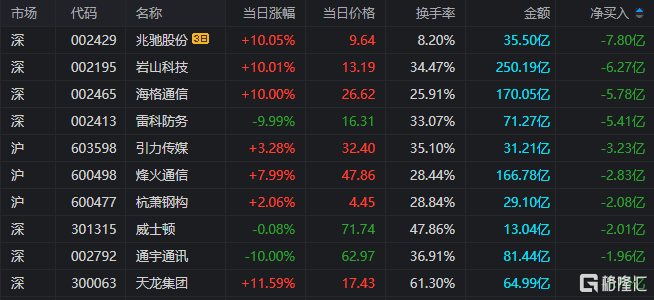 龙虎榜单日净卖出额前三为岩山科技、海格通信、雷科防务,分别为6.27亿元、5.78亿元、5.41亿元。