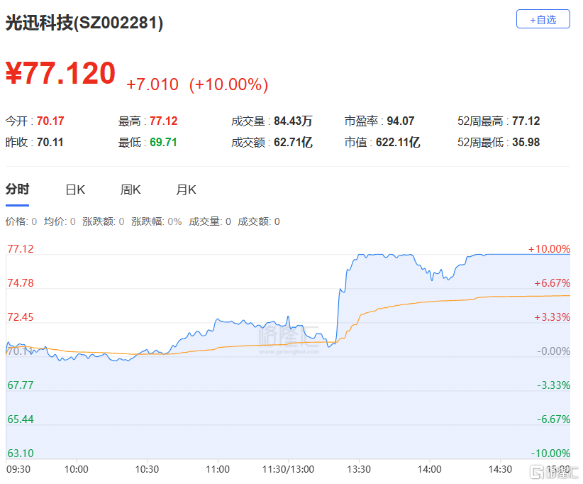 光迅科技:今日涨停,偏离值9.35%,换手率10.83%,成交额62.71亿。龙虎榜数据显示,机构净买入5.16亿元,深股通专用席位净买入3.19亿元。