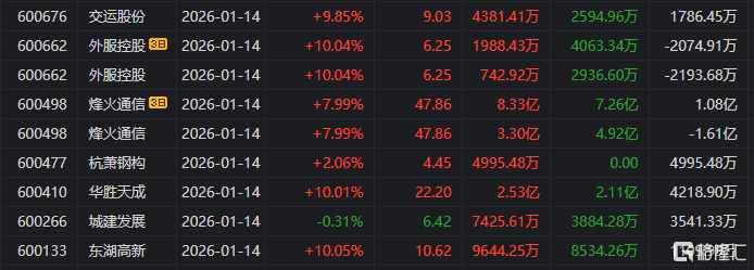 在龙虎榜中,涉及沪股通专用席位的个股有13只,烽火通信的沪股通专用席位净卖出额最大,净卖出1.61亿元。