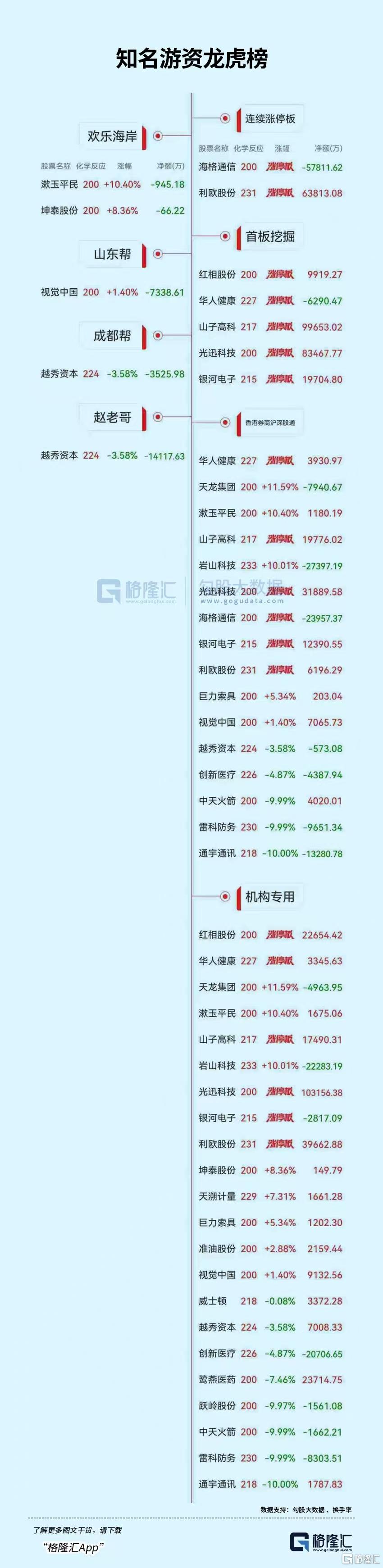 焦点股方面,实控人变更的嘉美包装19天14板,友邦吊顶10天8板,银河电子8天7板,国晟科技8天5板,利欧股份、美年健康等4连板,浙文互联、天下秀等4天3板,新华网、三江购物3连板,国际医学、海王生物2连板。