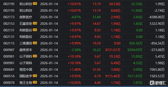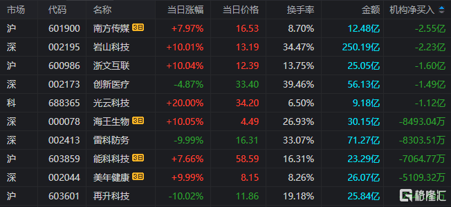 龙虎榜中涉及机构专用席位的个股中,当日净卖出额前三为岩山科技、浙文互联、创新医疗,分别为2.23亿元、1.60亿元、1.49亿元。