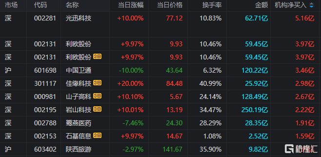 龙虎榜中涉及机构专用席位的个股中,当日净买入额前三为光迅科技、利欧股份、中国卫通,分别为5.16亿元、3.97亿元、3.46亿元。