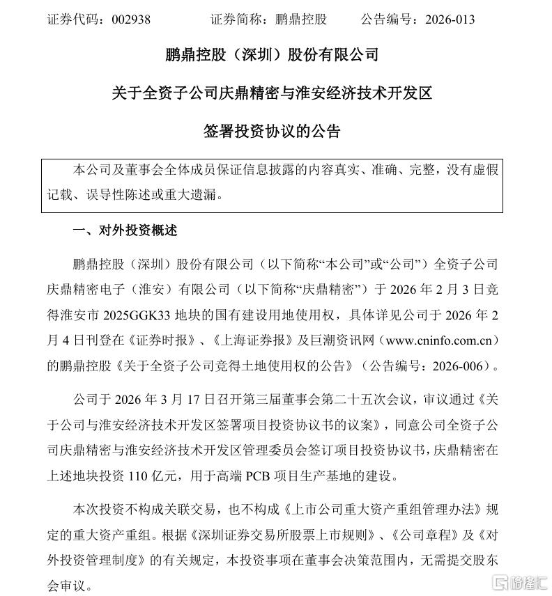 3月17日晚间,鹏鼎控股发布公告称,同意全资子公司庆鼎精密电子(淮安)有限公司与淮安经开区管委会签署项目投资协议,计划在江苏省淮安市投资110亿元建设高端PCB项目生产基地。