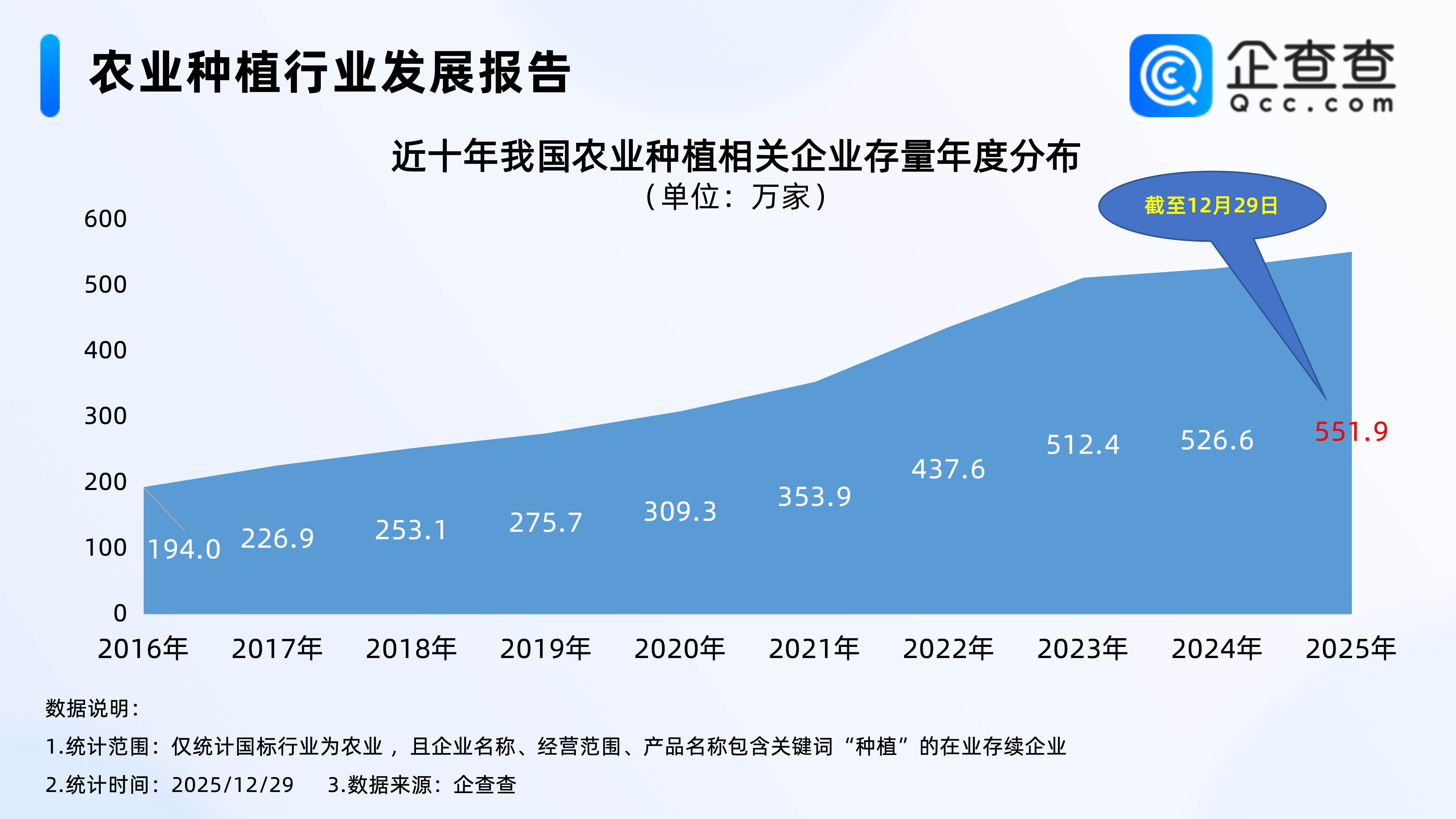 企查查数据显示,2016年以来,我国农业种植相关企业存量逐年增加,截至2023年年底,我国农业种植相关企业存量正式突破500万家,达512.4万家;截至2025年12月29日,我国现存551.9万家农业种植相关企业。