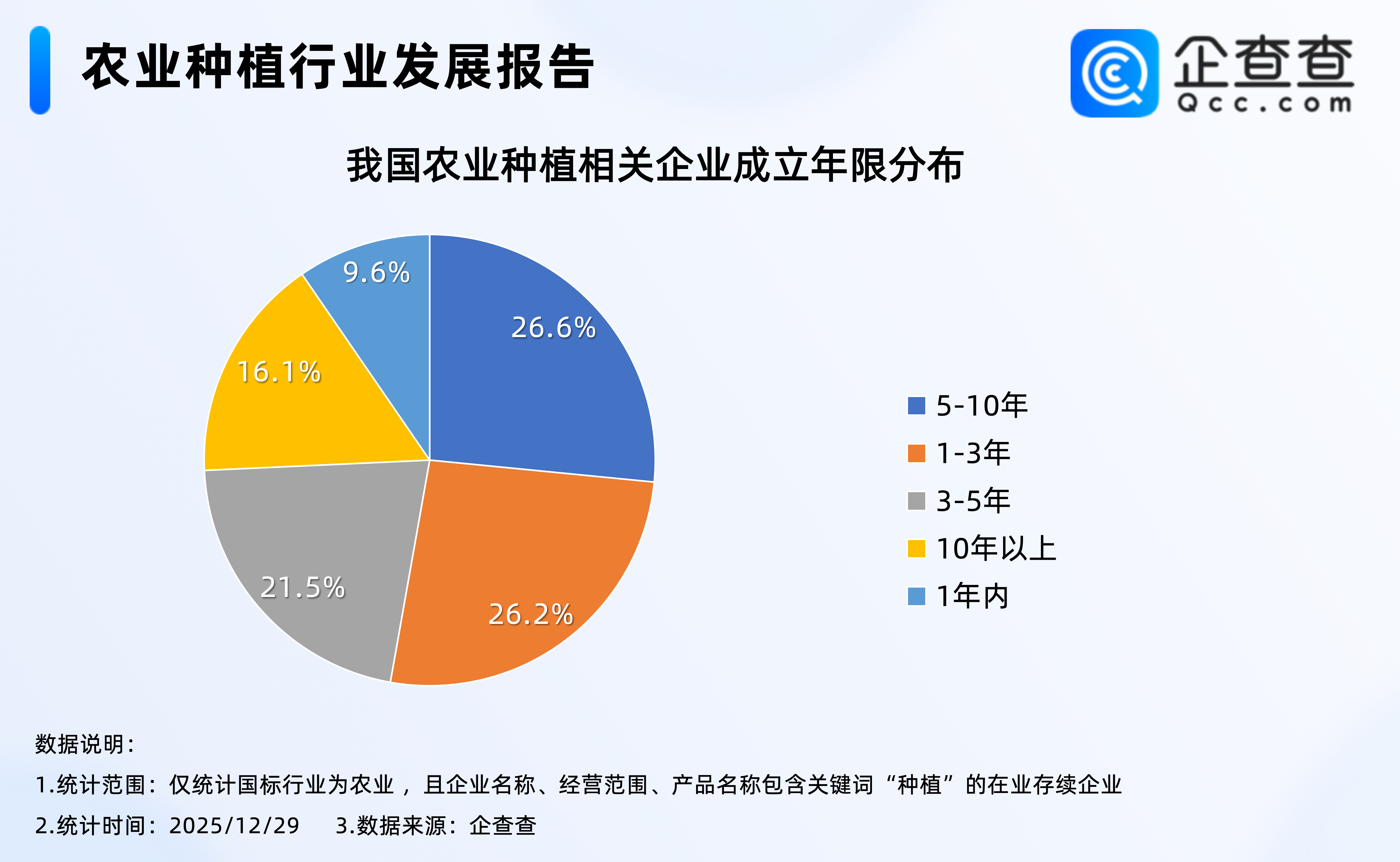 企查查数据显示,2025年以来,我国已注册54万家农业种植相关企业,区域分布上,位于华东地区的相关企业最多,占比22.0%;截至12月29日,我国现存551.9万家农业种植相关企业,其中成立5至10年之间的企业最多,占比26.6%。