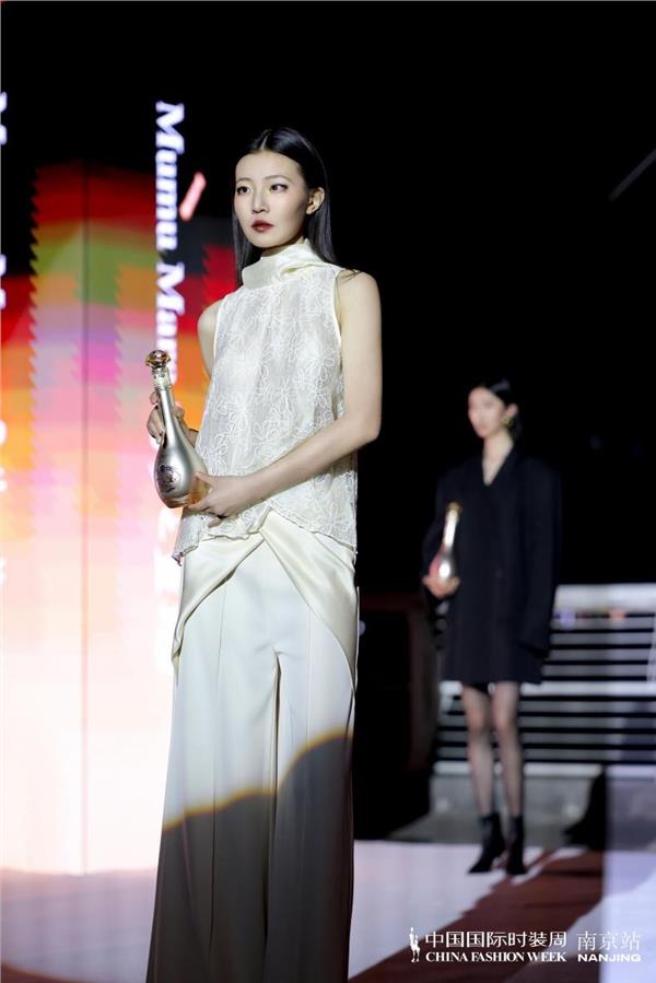 更有Mumu Mara × 洋河梦之蓝特别联名环节惊艳登场,将白酒文化的深厚底蕴与时装设计的先锋创意相融,通过面料肌理、色彩廓形,演绎东方美学的当代表达,成为秀场上独特而高级的视觉符号。