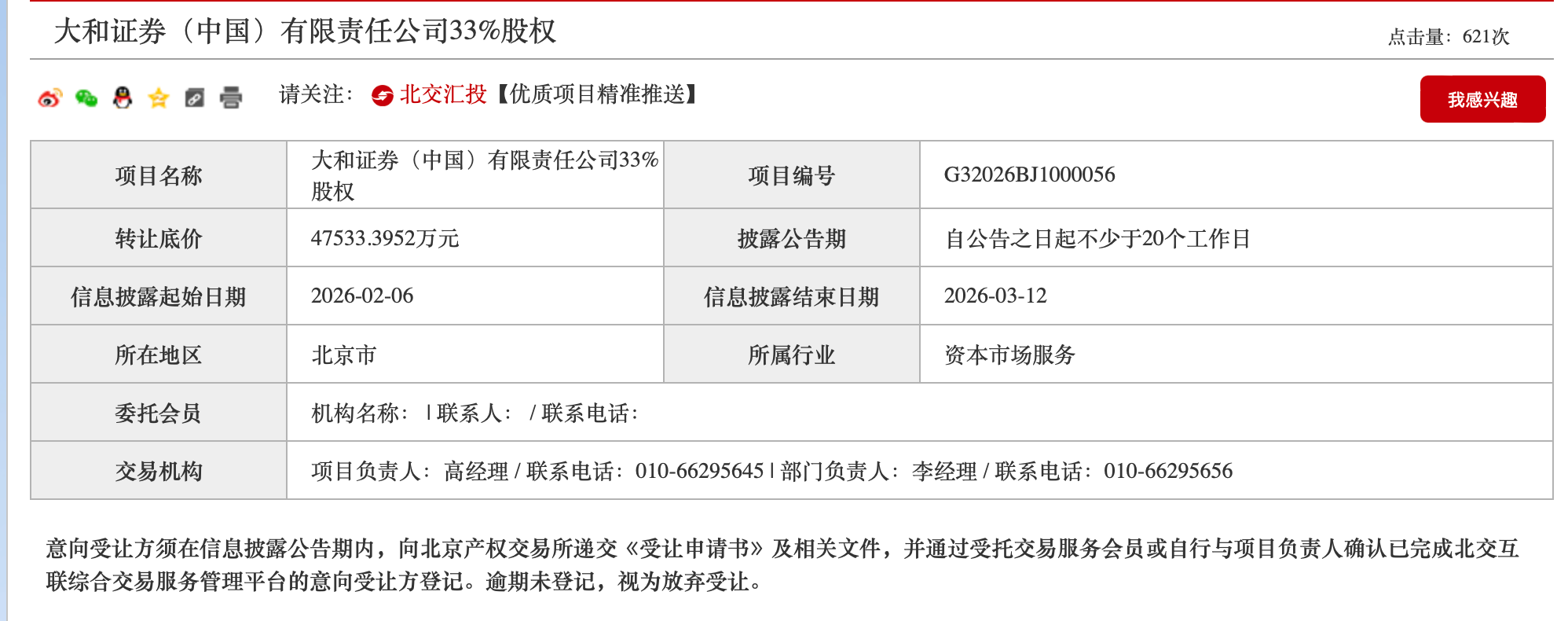转让方案要求这两笔股权必须“捆绑出售”,不接受单独购买。挂牌信息明确,持有51%控股权的日本大和证券集团总公司并未放弃优先购买权。