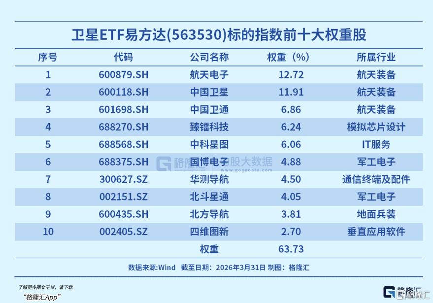 卫星ETF易方达(563530)跟踪中证卫星产业指数,涉及卫星制造、卫星发射、卫星通信、卫星导航、卫星遥感以及应用等领域的上市公司,权重股囊括卫星制造(中国卫星、航天电子)、运营(中国卫通)、导航(北斗星通华测导航)、遥感(中科星图)、核心器件(臻镭科技、国博电子)等。