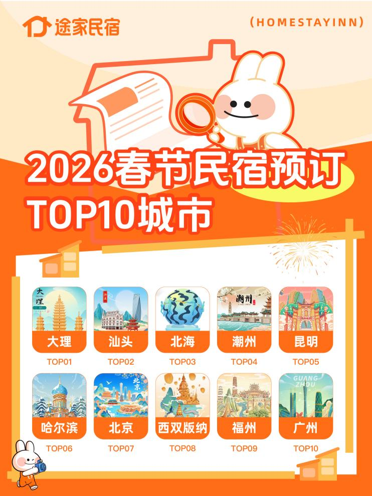 途家民宿的预订数据同样印证了这一趋势,春节民宿预订量TOP10城市中,八席为南方城市,大理、汕头、北海、昆明、福州稳居前列,温暖的气候、丰富的美食与人文景观,让南方城市成为全家出游的热门之选。