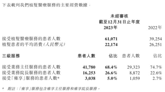 前文提到,目前植发普遍采用自体毛囊移植方法,该手法主要依靠医生将健康的毛囊一个个移植到脱发区,极度依赖高素质的植发医师。2023年,雍禾医疗接受业务主任服务的患者人数为4.18万人,占比68.4%。