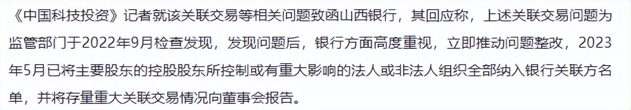 据《中国科技投资》报道,山西银行对此解释,上述关联交易问题为监管部门2022年9月检查发现,发现问题后银行已推动整改,并于2023年5月将主要股东的控股股东所控制或有重大影响的法人或非法人组织全部纳入银行关联方名单。