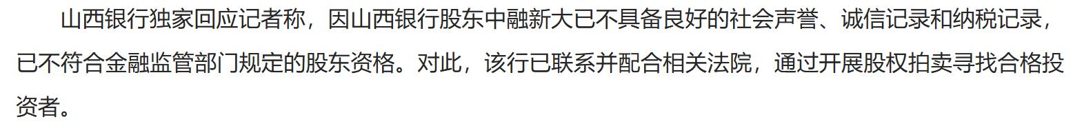 据《中国证券报》报道,山西银行对此回应称,“因中融新大已不具备良好的社会声誉、诚信记录和纳税记录,已不符合金融监管部门规定的股东资格,所以已联系并配合相关法院,通过开展股权拍卖寻找合格投资者。”与此同时,山西银行相关负责人表示,“推动中融新大股权拍卖是该行有序清退具有负面行为股东的重要举措。”
