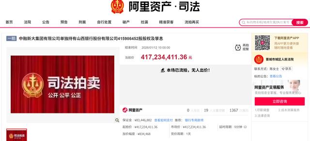 近日,阿里资产网站显示,中融新大持有的山西银行4.16亿股股权在经历24小时拍卖后,因无人出价而流拍。这笔起拍价4.17亿元的股权,是山西银行第四大股东的清仓式退出。