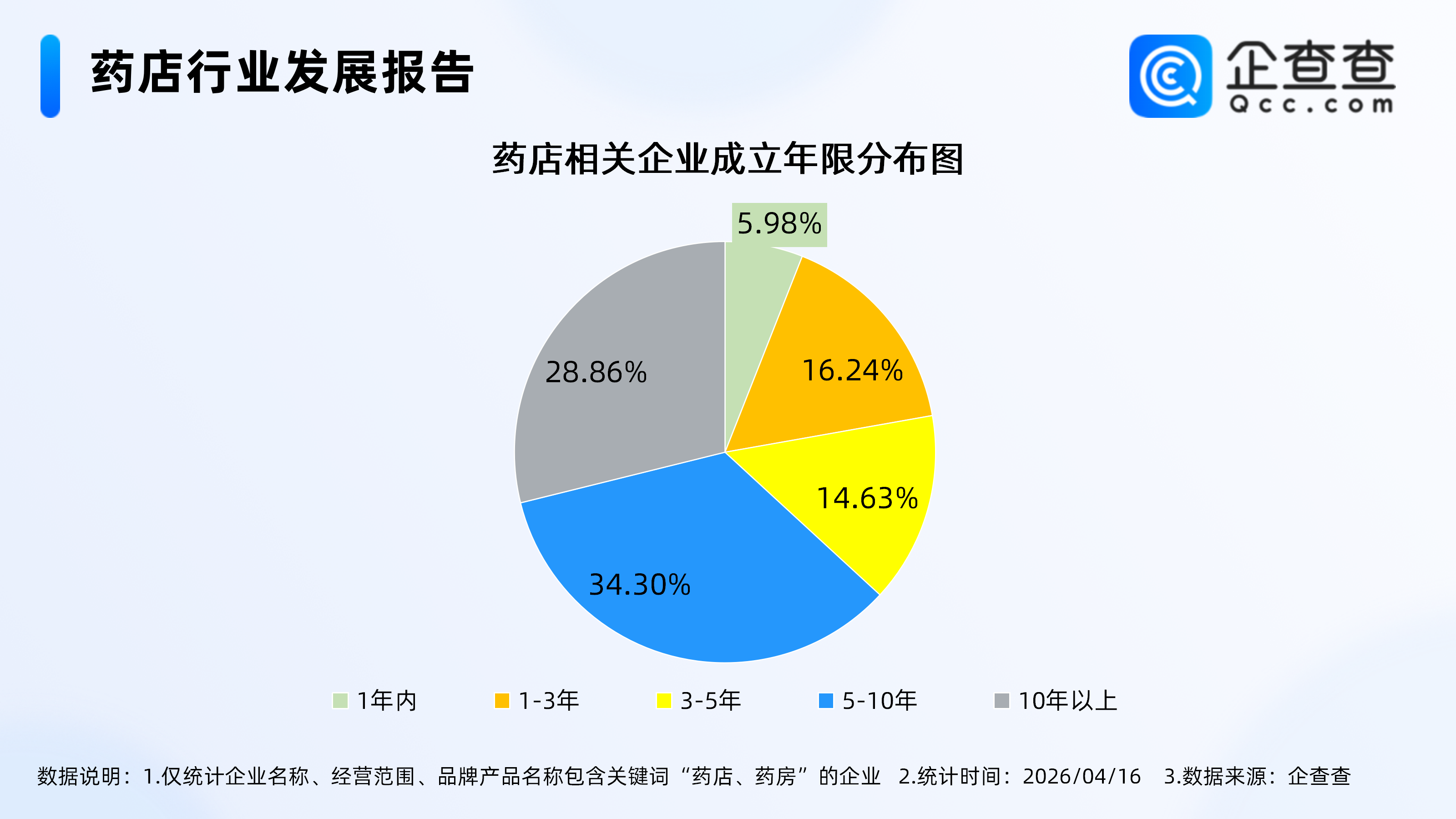 企查查数据显示,成立年限上,药店相关现存企业以成熟企业为主,其中成立年限在5-10年的企业占比最高,达34.30%。其次,成立10年以上企业占比28.86%。成立1年内成立的企业占比最低,为5.98%。